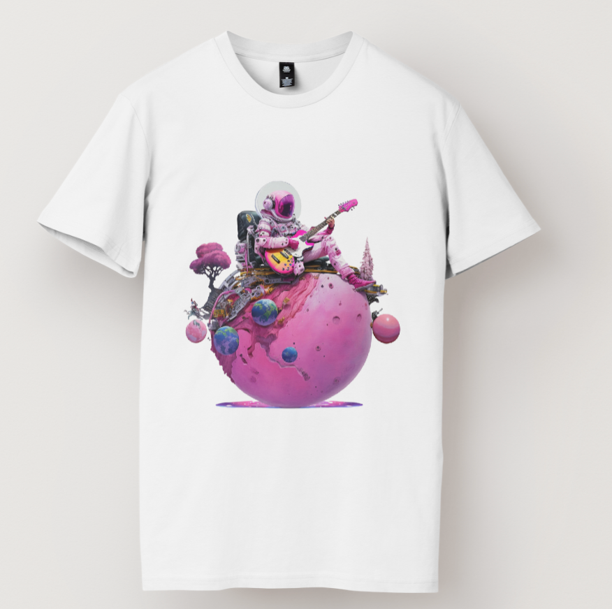 This white T-shirt features a vibrant, imaginative design of an astronaut sitting on a small, colorful planet.
