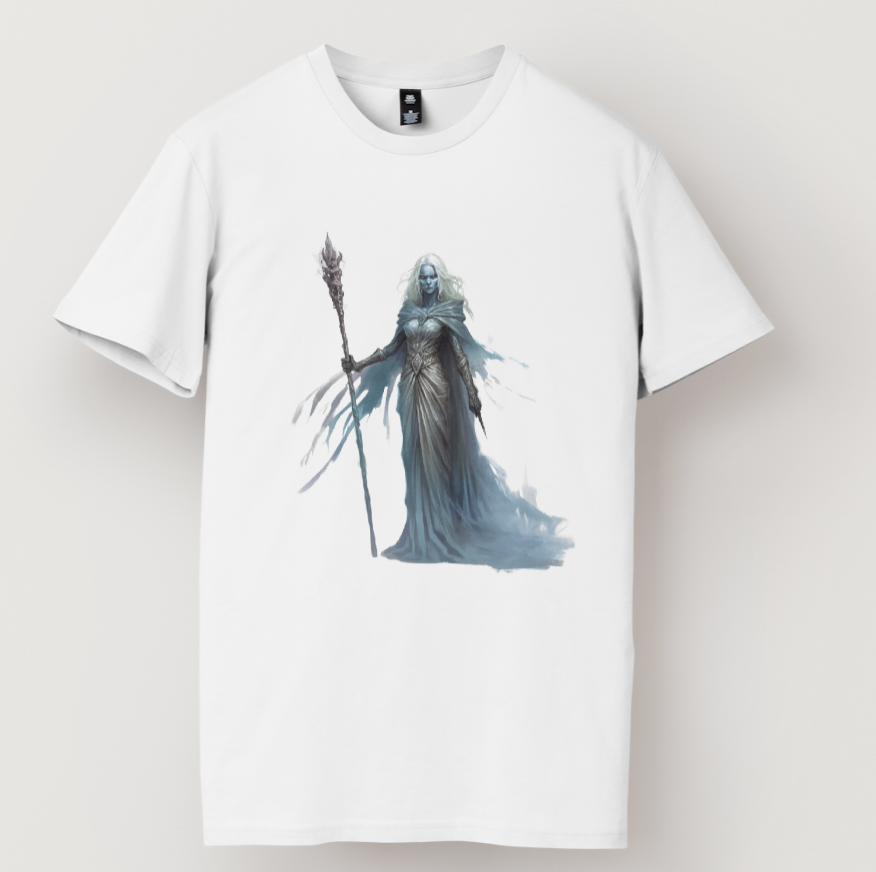 The design is centered on a white t-shirt, offering a contrasting and eye-catching look.