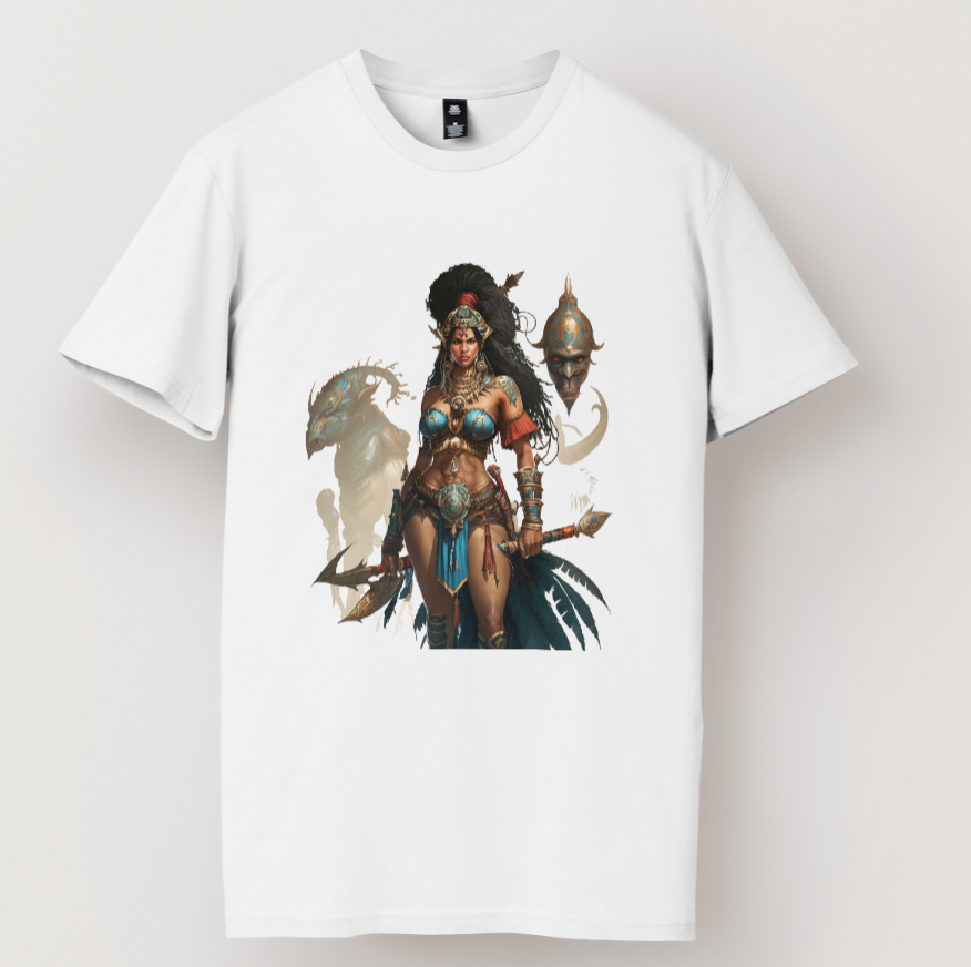 The design is detailed, with the woman wearing ornate tribal-inspired attire, including intricate jewelry and feathered accessories.
