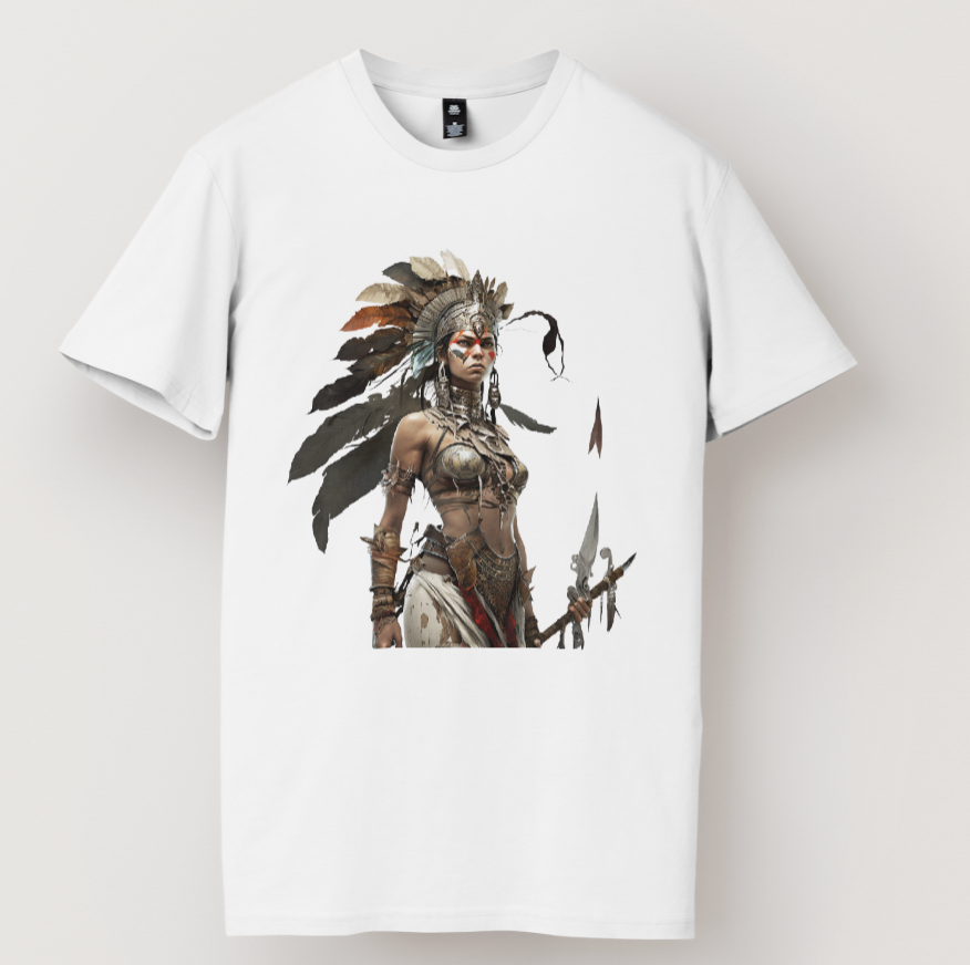The design is detailed, with the woman wearing ornate tribal-inspired attire, including intricate jewelry and feathered accessories.