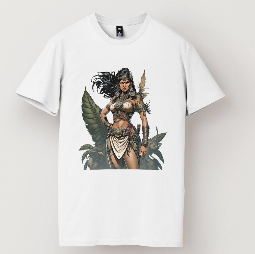 This white t-shirt features a striking graphic of a warrior woman.