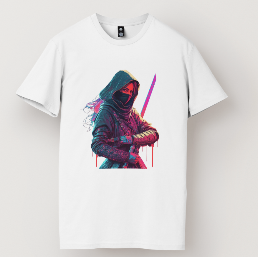 This white t-shirt features a striking and colorful graphic of a ninja.