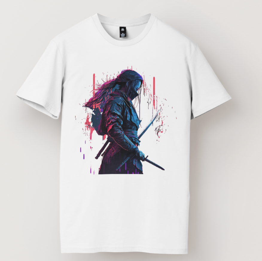This white t-shirt features a striking and colorful graphic of a ninja.