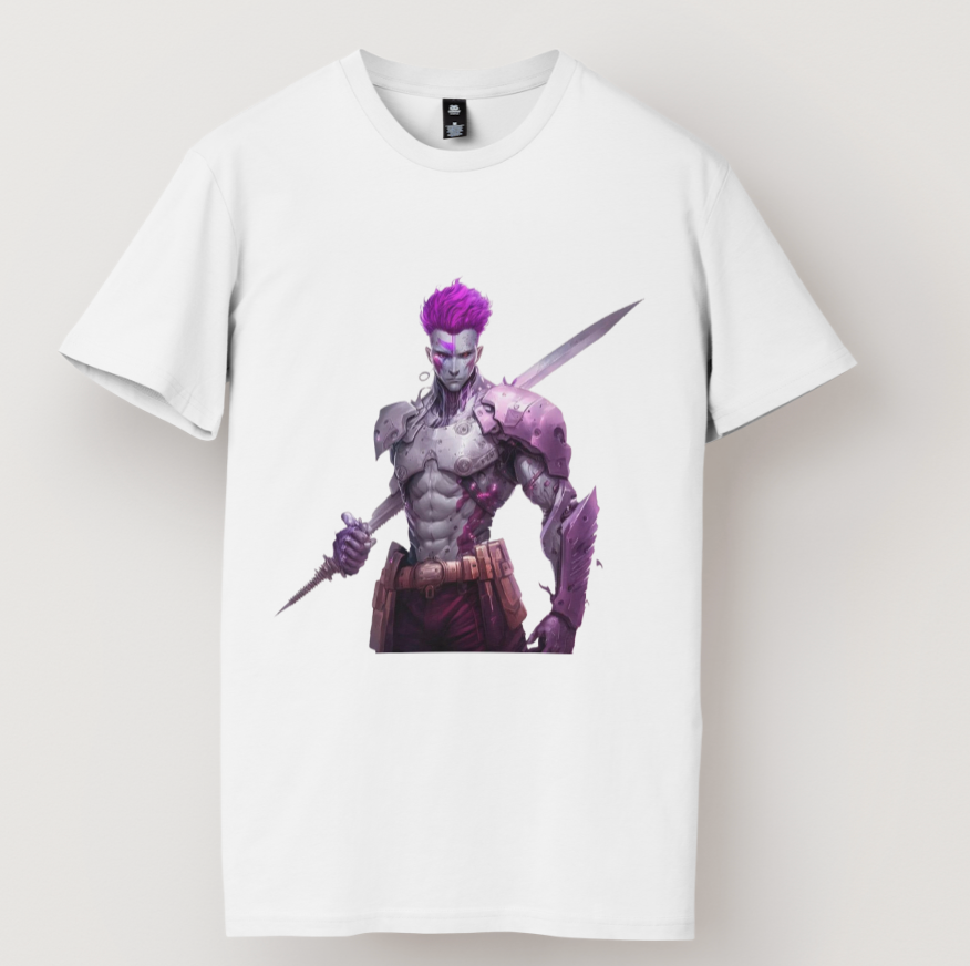 This white t-shirt features a striking and colorful graphic of a Cybernetic warrior.